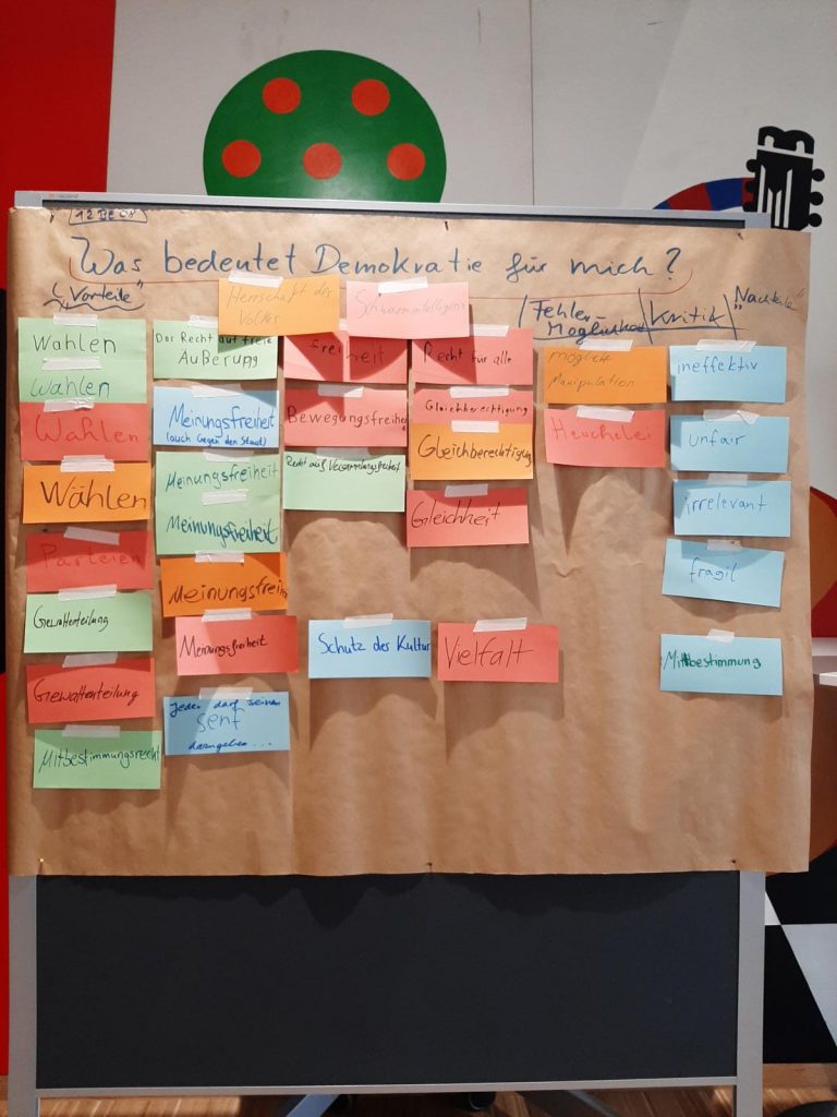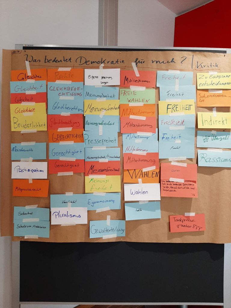 Im Eingangsbereich der Schule laden Plakatwände mit der Frage „Was bedeutet Demokratie für uns?“ die Schülerinnen und Schüler dazu ein, ihre Gedanken und Meinungen zu teilen – ein sichtbares Zeichen lebendiger demokratischer Kultur im Schulalltag.